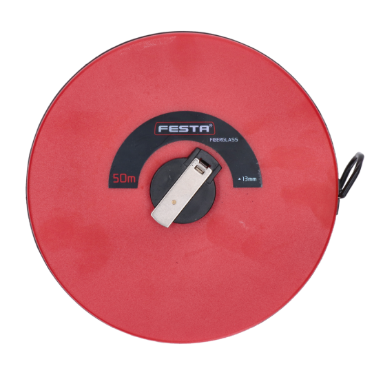 50m sklolaminátové měřící pásmo, páska zakončená očkem s gumovou ochranou, sklopná navíjecí rukojeť, poutko