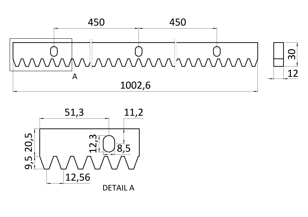 Hřeben kovový o rozměrech 30x12 mm s délkou 1000 mm je navržen pro použití jako součást mechanismu pro pohyb posuvných bran. Je vhodný pro brány s maximální hmotností až do 2200 kg. Tento kovový hřeben je vybaven třemi úchyty pro uchycení, které jsou dodávány spolu se šrouby, což zajišťuje pevné a stabilní připevnění k bráně. Díky pozinkovanému povrchu je odolný vůči povětrnostním vlivům a koroznímu působení.