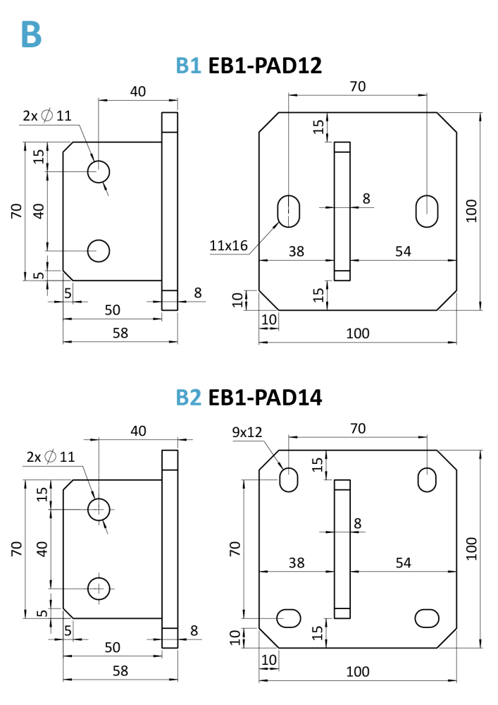 Kotvící příruby: EB1-PAD12 nebo EB1-PAD14 – pro bezpečné a pevné přichycení k podkladu