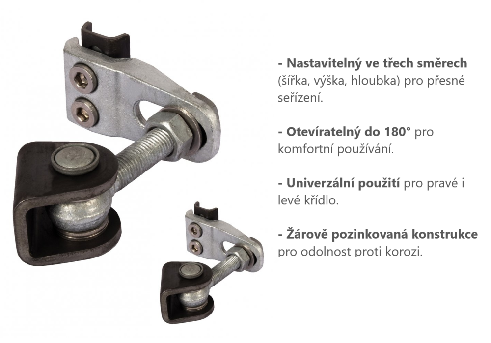 Po instalaci je pant nastavitelný ve třech směrech – na šířku (35 mm), výšku (19 mm) a hloubku (59 mm). Toto umožňuje přesné seřízení a vyrovnání vyosených křídel, například vlivem deformace sloupku mrazem. Pant je univerzální, vhodný pro pravé i levé křídlo vrat.