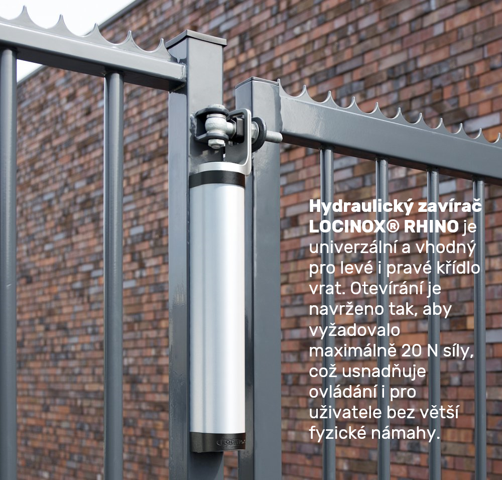 LOCINOX® RHINO je hydraulický zavírač křídlových vrat s úhlem otevírání až 180°, navržený pro přímou montáž na panty se závitem M16 a M20, konkrétně modely LOCINOX® EXCENTRO, GBMU, GBMU4D a BOLTON4D. Tento zavírač nabízí spolehlivé a plynulé zavírání vrat s možností přesného nastavení rychlosti zavírání i koncového zaklapnutí. Doporučuje se použití šroubu s okem (1034ROLL-M16) pro optimální bezpečnost. Dostupná barva RAL 9005 černá nebo ZILV stříbrná.