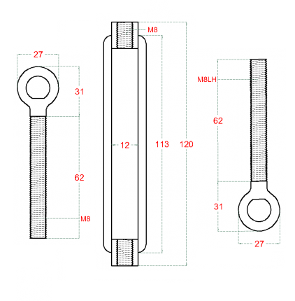 Nerezový napínák s oky a závitem M8 a LH8 je určen pro přesné napínání nerezových lan a tyčí v zábradlí, stavebních konstrukcích nebo jiných aplikacích. Vyroben z kvalitní nerezové oceli AISI 304, která zajišťuje vysokou pevnost, odolnost proti korozi a dlouhou životnost i v náročných podmínkách. Díky opačným závitům (pravý M8 a levý LH8) umožňuje jednoduché a efektivní napínání bez nutnosti otáčení celého systému.