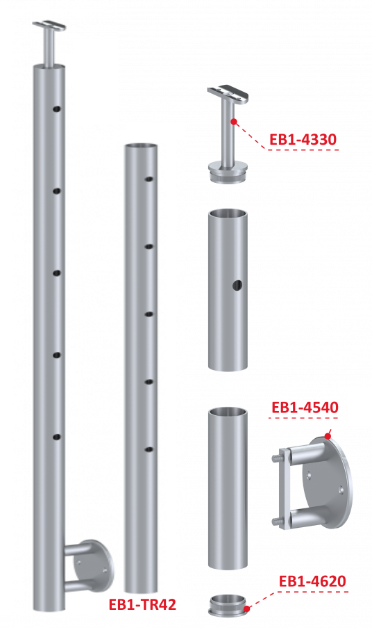 Nerezový sloup, boční kotvení, 5 děrový průchodný, vrch pevný (ø42,4x2 mm), broušená nerez K320 / AISI304