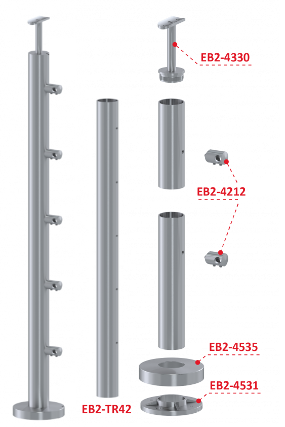 Nerezový sloup, vrchní kotvení, 5 řadový průchodný, vrch pevný (ø42,4x2 mm), broušená nerez K320 / AISI316