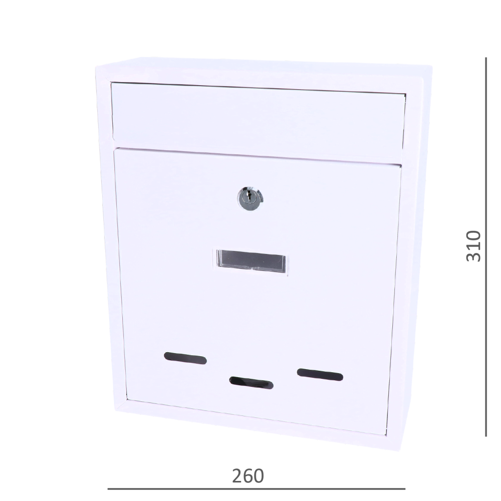 Tato kompaktní a elegantní poštovní schránka v bílé barvě je ideální volbou pro domácnosti, byty i menší firmy. Díky rozměrům 260 x 310 x 95 mm bez problémů pojme běžnou poštu a zásilky až do formátu A4, což umožňuje doručování větších obálek a dokumentů bez nutnosti jejich přehýbání. Schránka je vyrobena z kvalitního kovu s odolnou povrchovou úpravou v bílé barvě, která chrání před povětrnostními vlivy a zajišťuje dlouhou životnost. Moderní design v čistém bílém provedení se snadno přizpůsobí různým typům fasád a plotů.