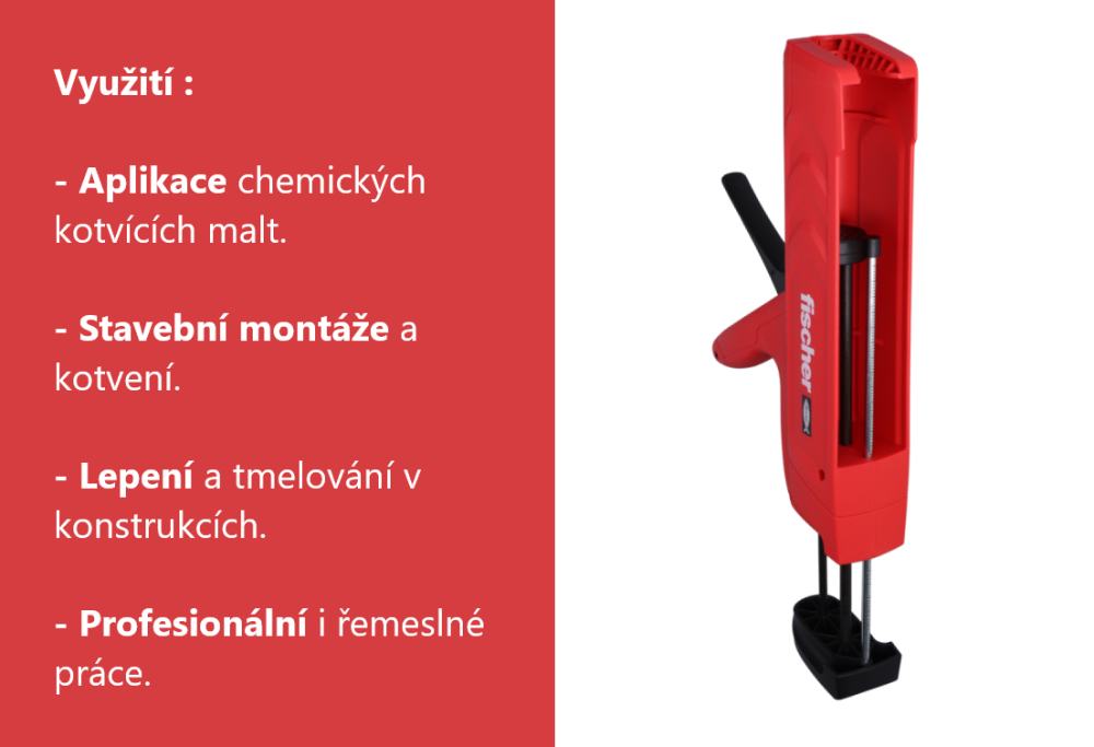 Profesionální pistole FIS DM-S Pro pro kartuše 300–390 ml je ergonomická aplikační pistole určená pro rychlé a nenáročné vytlačování chemických malt, silikonů, lepidel i tmelů. Je kompatibilní s velikostmi kartuší 150 ml, 300 ml, 360 ml a 390 ml včetně jednokomorové i dvoukomorové verze. Pistole má optimalizované rozložení hmotnosti pro pohodlnou práci i při delším používání. Plastové tělo vyztužené skelnými vlákny zajišťuje vysokou stabilitu a odolnost. Jednoduchý design umožňuje rychlou výměnu kartuší a efektivní aplikaci materiálu bez zbytečného úsilí.