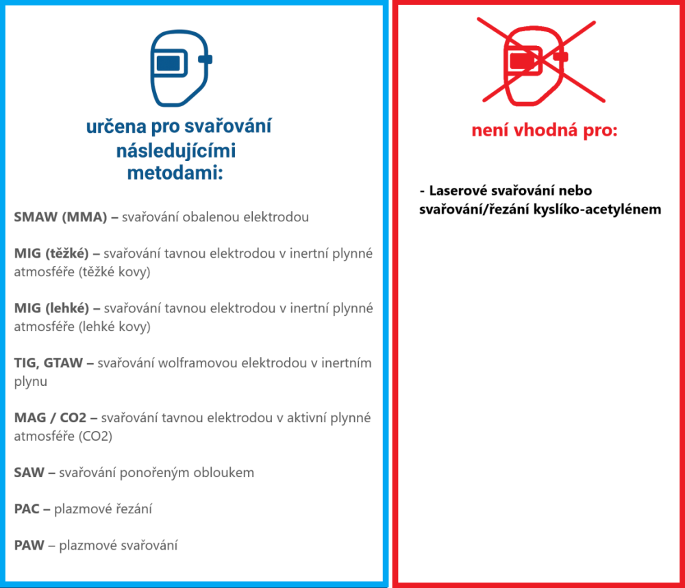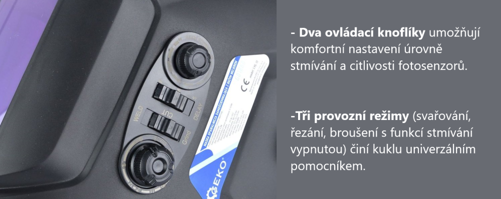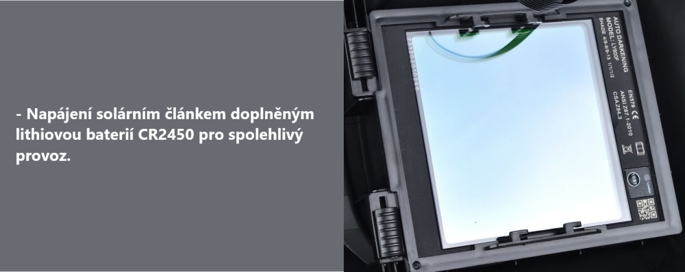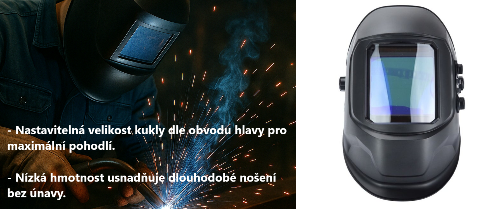 Samostmívací svářecí kukla s velkým průzorem, poskytuje ochranu očí i obličeje během svařování, řezání nebo broušení. Tato automaticky stmívací kukla chrání uživatele před nebezpečnými jiskrami, postřiky a škodlivým UV i IR zářením, a díky velkému průzoru umožňuje pohodlný výhled na pracovní oblast. Ve filtrační kazetě jsou čtyři fotosenzory (obloukové senzory), které reagují na světlo svařovacího oblouku, automaticky rozpoznají začátek svařování a aktivují funkci automatického stmívání. Po dokončení práce se filtr automaticky vrátí do světlého stavu.