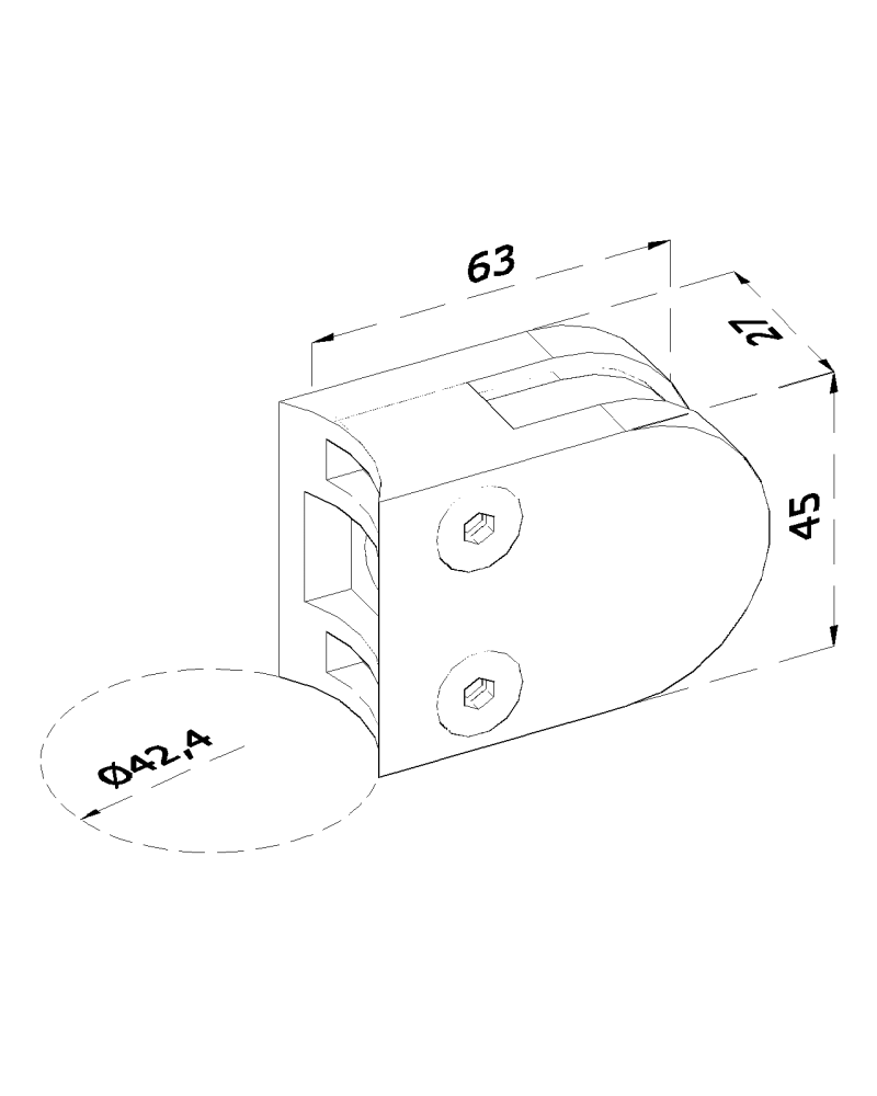 Svorka skla na trubku ø 42,4 mm (63x45x27 mm), broušená nerez K320 / AISI304, balení neobsahuje gumičky na sklo